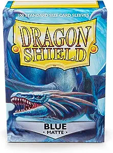 "Clear front & Blue back. Like a cerulean pearl from the deep sea. Matte sleeves are our popular line of textured Dragon Shield with superior handling. A perfect mix of durability and shuffle-ability. The professor's #1 pick for card sleeves. The sturdy cardboard box fits 75+ single sleeved cards or 65+ double sleeved cards. Every box has a label at the top of the box for personalization. PVC-free polypropylene sleeves, no acid. Archival safe. Matte 120 μm quality thickness. For cards measuring up to 63x88 mm's (2½""x3½"")."